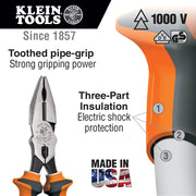 Klein Tools Electricians Insulated Combination Pliers are 1000V rated and VDE certified for safety on the job. The multi-color, sleek design with small thumb guards make for easy handling and storage. The three-part insulation with a white underlayer provides a warning sign that insulation may be compromised. The durable, molded insulation meets or exceeds IEC 60900 and ASTM F1505 standards for insulated tools. These pliers feature a high-leverage design, with the rivet closer to the cutting edge for 40% greater cutting and gripping power than other pliers designs.