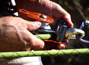 To open the Omni sideplate, the user pushes the button and rotates the sideplate. A safety catch stops the sideplate from rotating completely open until the button is pushed a second time. The sideplate is easily closed by squeezing the sideplate into the body of the pulley. Two loud clicks are heard as the sideplate pushes past the button to close securely against the body of the pulley.