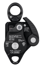 Releasable, the TWIN RELEASE progress capture pulley is designed to set up 4:1 haul systems for work in confined spaces or for technical rescue. Releasing the cam is possible with the ergonomic handle. The brake integrated into the moving side plate and the main faceted sheave with single-direction rotation, offer additional braking and better control when lowering heavy loads. The two sheaves provide excellent hauling efficiency. The swivel facilitates operations, allowing the pulley to be oriented under load and direct connection of carabiners, ropes, or slings.