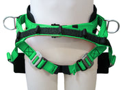 The Classic Saddle Series provide one accessory ring for first aid and two accessory loops. Designed with forged medium dee rings, interlocking leg strap buckles and suspender connection loops. 7″ Tuff Duck covered back support provides saddle rigidity. Multiple friction buckles for easy adjustments and positive locking provides user an ideal center of gravity. Two rugged and versatile handsaw snaps and heavy duty elastic extensions for leg pads or batten seat. A Classic Versatile ArborMaster® saddle that has five loops for overhead suspension and a batten seat. Comes with a friction buckle waist closure.